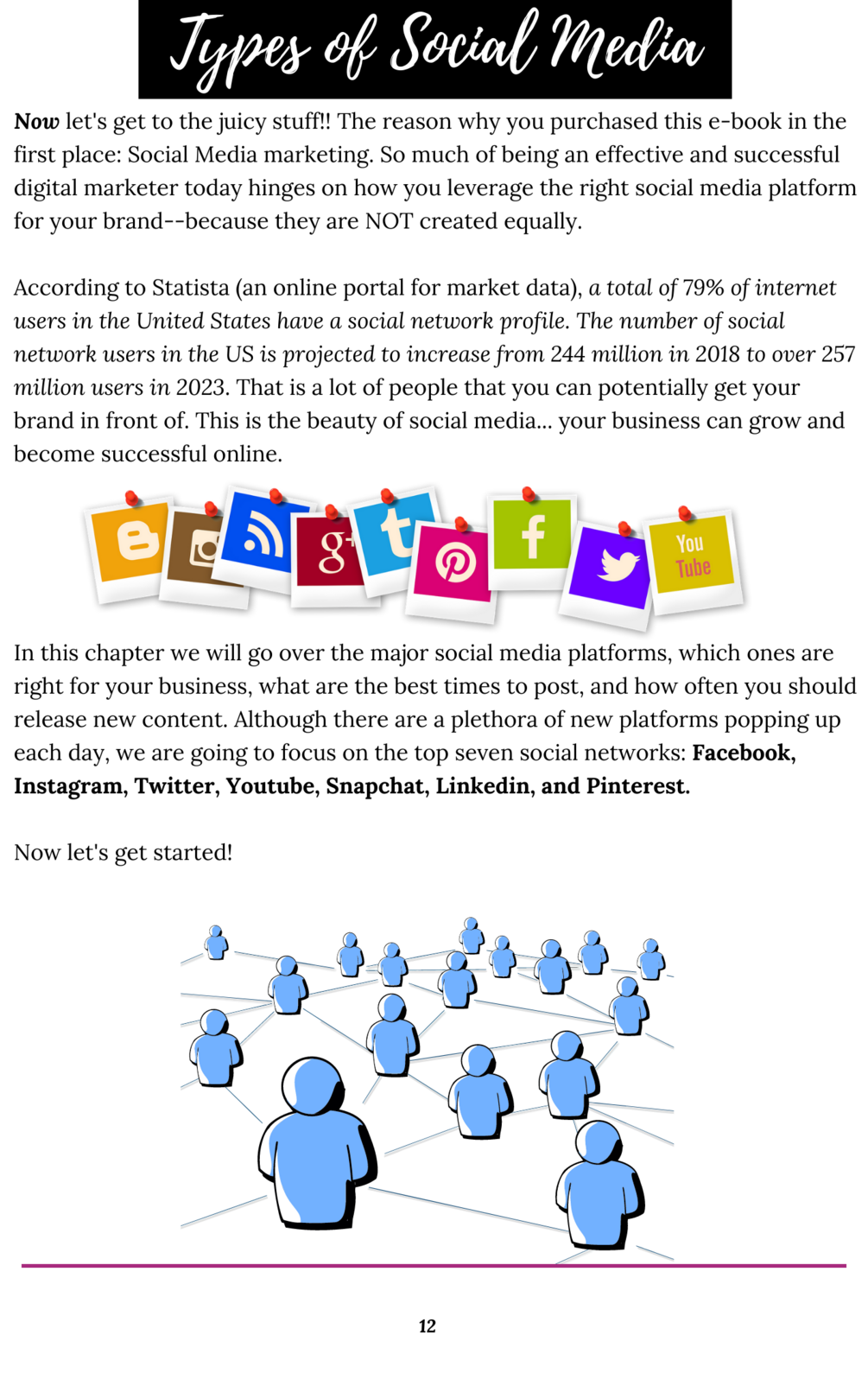 You'll get an informative eBook that'll teach you how to: find your brand voice, target your niche audience, find the best platform for your business, create content calendars (with ideas), build brand awareness, and create captivating content using these 50+ resource tools.